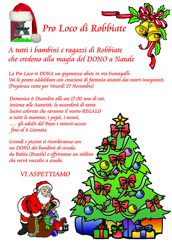 Pro loco e associazioni di Robbiate hanno organizzato per domenica 6 dicembre una festa di "introduzione" al Natale con spettacoli e momenti di intrattenimento per le vie del paese. I più piccoli avranno la possibilità di recarsi presso l`ufficio postale di Babbo Natale per consegnare le loro letterine, i più grandi potranno invece passeggiare tra le bancarelle del mercatino alla ricerca di qualche regalo e curiosità. In Piazza Repubblica ci sarà la possibilità di gustare risotto coi funghi, cassoela, assaggi di miele, dolci e torte mentre in Piazza Brivio-Terzuolo a farla da padrone saranno la polenta, il gorgonzola, il cotechino e le lenticchie. Vin brulé e Trippa in Piazza Strazza mentre in Via Aldo Moro una gustosa castagnata. I bambini delle scuole offriranno gli addobbi per l`albero di Natale, che sarà acceso con un momento di grande suggestione a partire dalle ore 17, e ci si potrà divertire anche con la slitta gonfiabile, il trenino e le truccatrici.